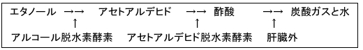 アルコールは体内に入ると、下のように代謝されていきます。主成分であるエタノールは小腸で大部分が吸収され肝臓に送られて処理されます。